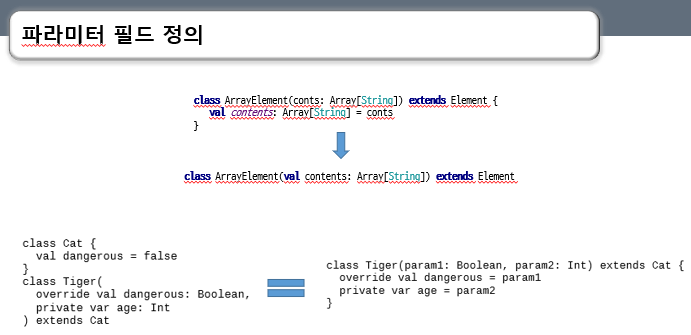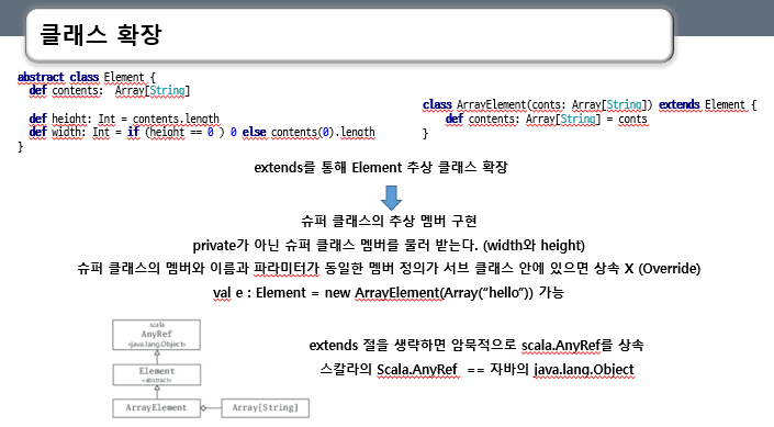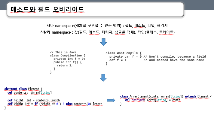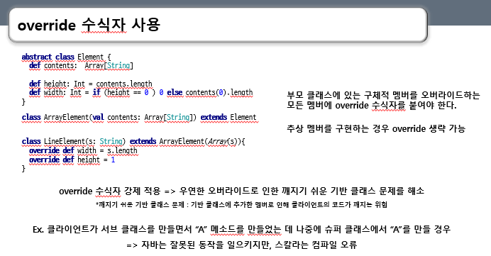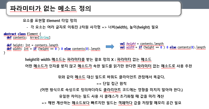 스칼라는 메소드와 필드를 같은 개체로 인식해 추상 메소드를 서브 클래스에서 메소드가 아닌 필드로 변경할 수 있다.