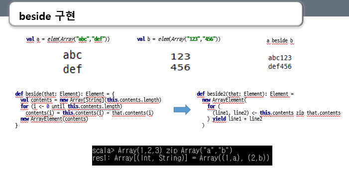 beside를 수행하면 가로로 결합한 요소가 생성됩니다. 요소를 결합할 때 결합한 요소 간 길이가 맞지 않으면 양 옆에 빈 칸을 붙여서 가운데 정렬을 수행합니다.