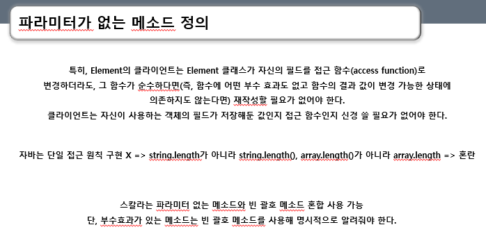 클래스의 이용 형태는 시간이 지남에 따라 달라진다. 파라미터가 없는 메서드 정의를 통해 Element 클래스를 사용하는 클라리언트가 Element의 내부 구현에 영향을 받지 않는다.