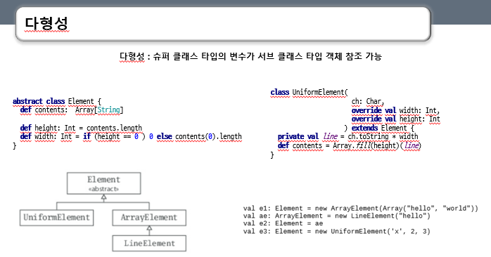 그래서 왼쪽과 같은 관계가 형성되고 다형성에 의해 Element 타입의 변수에는 Element의 서브 클래스 타입 객체 참조가 가능해 집니다.