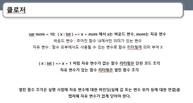 즉, 열린 함수 조각을 자유 변수를 없애 닫힌 코드 조각처럼 닫는 다고 해서 자유 변수가 있는 열린 함수 조각을 클로저라고 합니다.