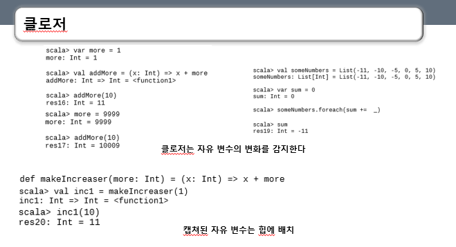 “ (x:Int) => x+1” 처럼 자유 변수가 없는 함수 리터럴은 닫힌 코드 조각이라 하고 자유 변수가 있는 함수 리터럴은 열린 함수 조각이라고 합니다.