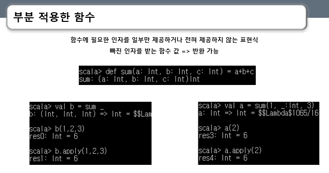 스칼라 컴파일러 내부적으로는 sum _ 이 b에 할당될 때 3개의 인자를 요구하는 클래스 인스턴스를 만들고 b(1,2,3)과 같이 호출을 할 때 b.apply로 바꾸게 됩니다.