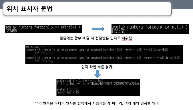 코드와 같이 “x=>” 화살표를 생략하고 “x=>”를 생략하게 되면 foreach 함수 리터럴 내부에서 사용되는 각 원소를 식별할 수 있는 식별자가 없기 때문에 “_”를 사용해 함수 호출 시 전달받은 인자가 채워지도록 할 수 있습니다.